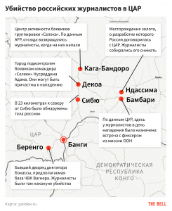 - Вечером 1 августа Центр управления расследованиями рассказал, куда направлялись погибшие накануне журналисты Орхан Джемаль, Александр Расторгуев и Кирилл Радченко собирались встретиться с сотрудником миротворческой миссии ООН в Центральноафриканской республике (MINUSCA). Он должен был помочь журналистам со съемками золотых приисков в окрестностях Ндассима на юге страны.