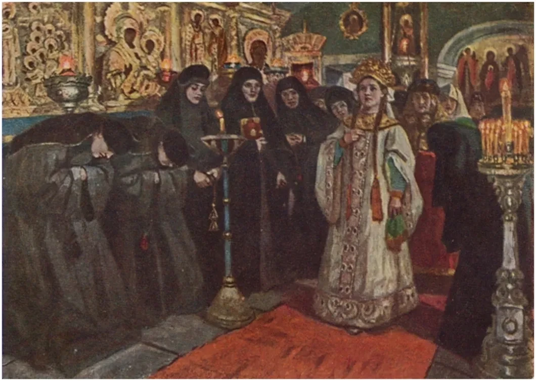 Вспоминаю давнее, более чем на четверть века удалённое от нас, сегодняшних, зимнеепосещение женского Покровского монастыря в Суздале. Я тогда записал в дневнике, что обжигающе синие глаза одной из молодых монахинь оживили в моей памяти суриковское «Посещение царевной женского монастыря». Почему-то представилось, что там, у Сурикова, у молодой монахини, третьей слева (а именно её фигура во взаимосвязи с фигурой самой царевны придаёт всей картине композиционную устойчивость), такие же синие-пресиние, нестеровские глаза.