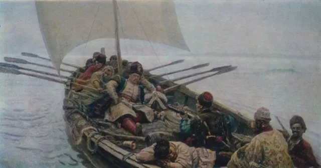 Кстати, эскиз 1887 года, вроде бы, — тому подтверждение. Но ничего ведь подобного в самой картине уже нет. Художник от этого мотива отказался. А что есть? Есть другая песня — широкая, задумчивая, исполненная великой печали. Песня безбрежной, могучей реки. Всплеск вёсел. Парус, неумолимо затягивающий этот челн, этих людей в утренний простор. Есть тишина простора. Молчание людей. Есть предчувствие поражения, своего личного конца на фоне этого паруса и этого рассвета. Тяжёлое похмелье. Тяжёлые думы. Даже обида какая-то в глазах Разина. На жизнь? На бесполезность бунта?