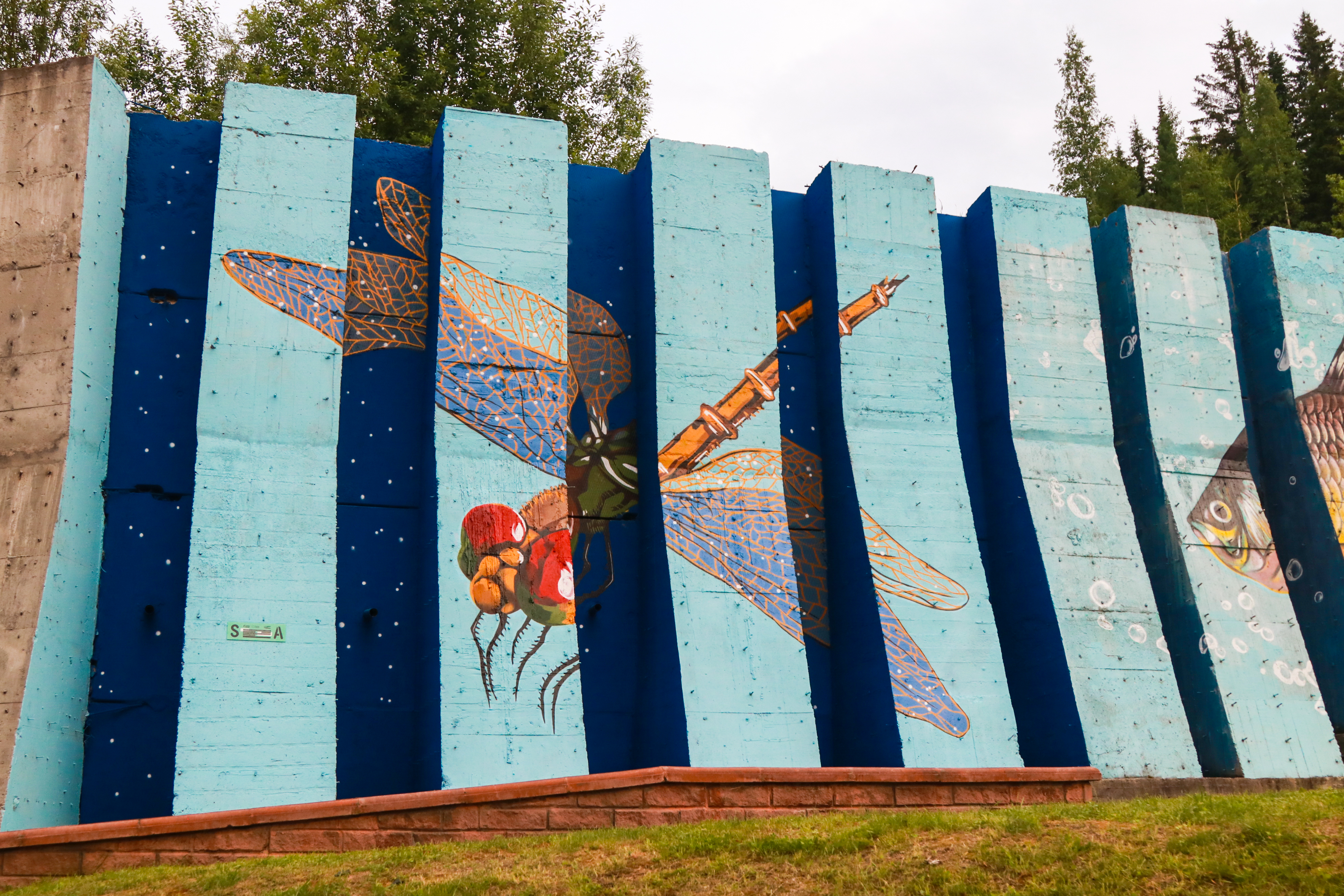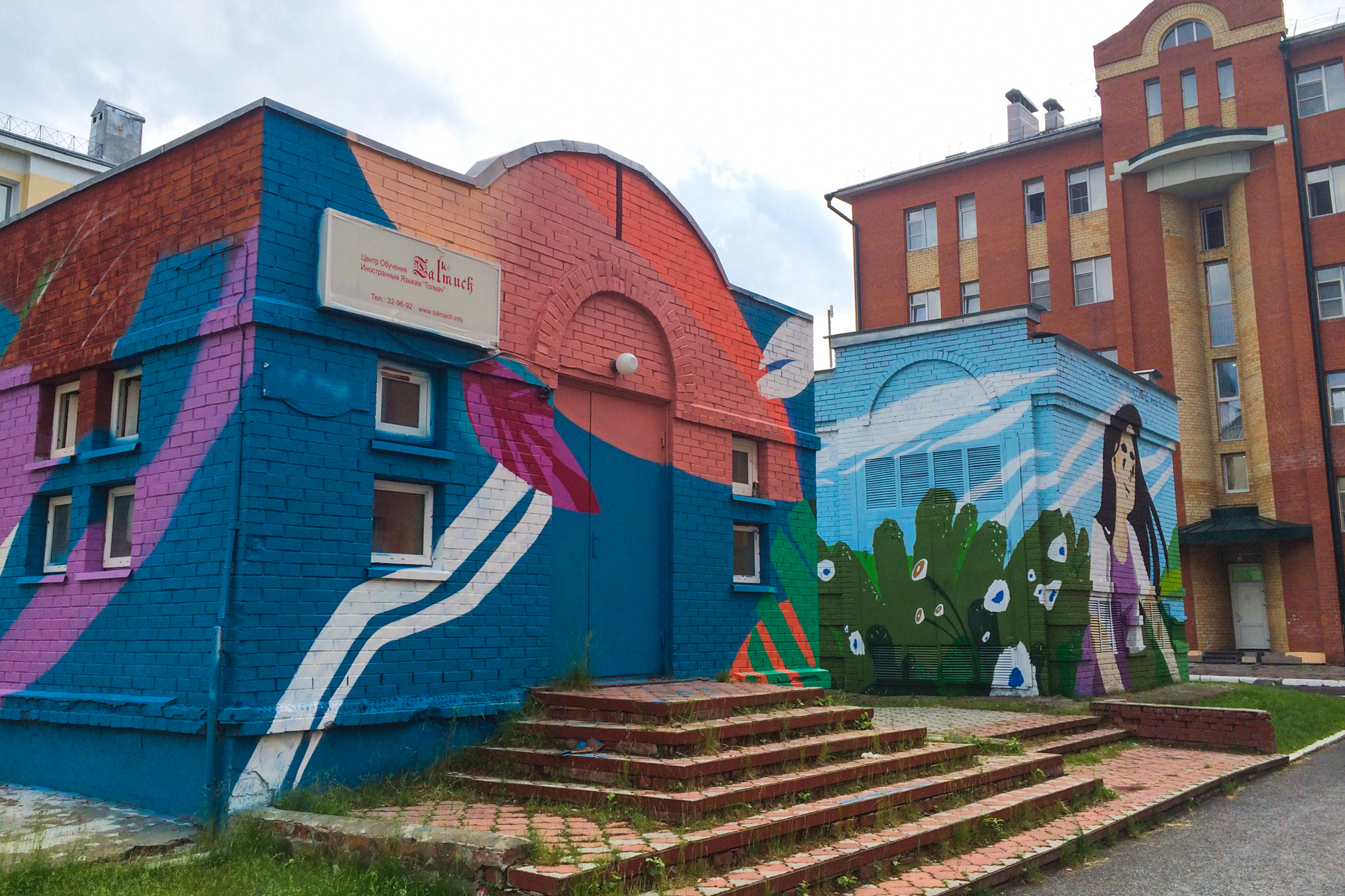 Первое граффити от "Стенограффии" появилось на стене возле Центра искусств для одаренных детей Севера. Долгое время это здание окружал серый бетон, благодаря граффитчикам унылое пространство меняется. Здесь уже красуются ворон, медведь и карась – типичные персонажи сибирского фольклора.