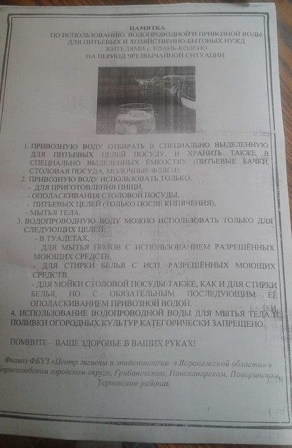 Между тем в больнице и детском саду села Елань-Колено были расклеены памятки с предупреждением об опасности водопроводной воды. Фотографию Лилия Ишкова опубликовала у себя на странице Facebook 26 июля. "Использование водопроводной воды для мытья тела и поливки огородных культур категорически запрещено", – говорится в документе. Внизу машинописная подпись: филиал ФГУЗ "Центр гигиены и эпидемиологии в Воронежской области".