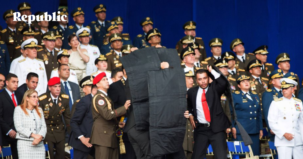 Через мгновение раздался взрыв. Один из генералов, стоявший рядом с венесуэльским лидером, пригнулся. Первая леди страны Силия Флорес вцепилась в руку председателя Верховного суда. Телохранители Мадуро закрыли его большими черными кевларовыми щитами. Военные, которые стояли колоннами, разбежались в разные стороны.