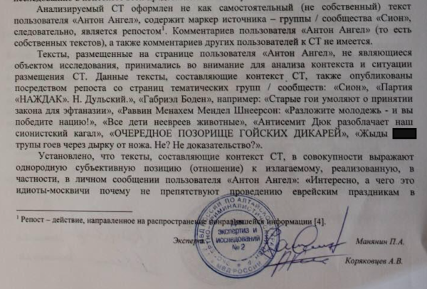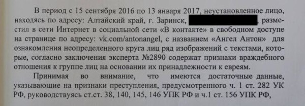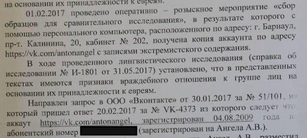 Из справки-меморандума МВД по Алтайскому краю следует, что ведомство получило «оперативную информацию» о размещении «враждебных к евреям» записей в январе 2017 года. Основанием стали жалобы двух пользователей «ВКонтакте» — Бобровой Н.C. и Денисова О.А., которые якобы случайно зашли на страницу Антона Ангела и, листая страницу, «обнаружили записи экстремистского содержания». Оба свидетеля во время опросов подтвердили свои показания. Ангел в разговоре с TJ заявил, что не знаком с Бобровой и Денисовым, а свои предположения не раскрывает по просьбе адвоката.