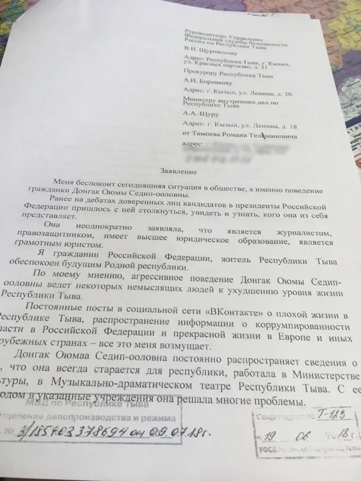 «Руководителю Управления ФСБ РФ по Республике Тыва, прокурору республики, министру внутренних дел от Тамоева Романа Телмановича. Заявление. Меня беспокоит сегодняшняя ситуация в обществе, а именно поведение гражданки Донгак Оюмы Седип-ооловны. <…> Я гражданин РФ, житель Республики Тыва, обеспокоен будущим Родной республики. По моему мнению, агрессивное поведение Донгак Оюмы Седип-ооловны ведет некоторых немыслящих людей к ухудшению уровня жизни Республики Тыва. Постоянные посты «ВКонтакте» о плохой жизни в Республике Тыва, распространение информации о коррумпированности власти в РФ и прекрасной жизни в Европе и иных зарубежных странах — все это меня возмущает» (орфография автора).