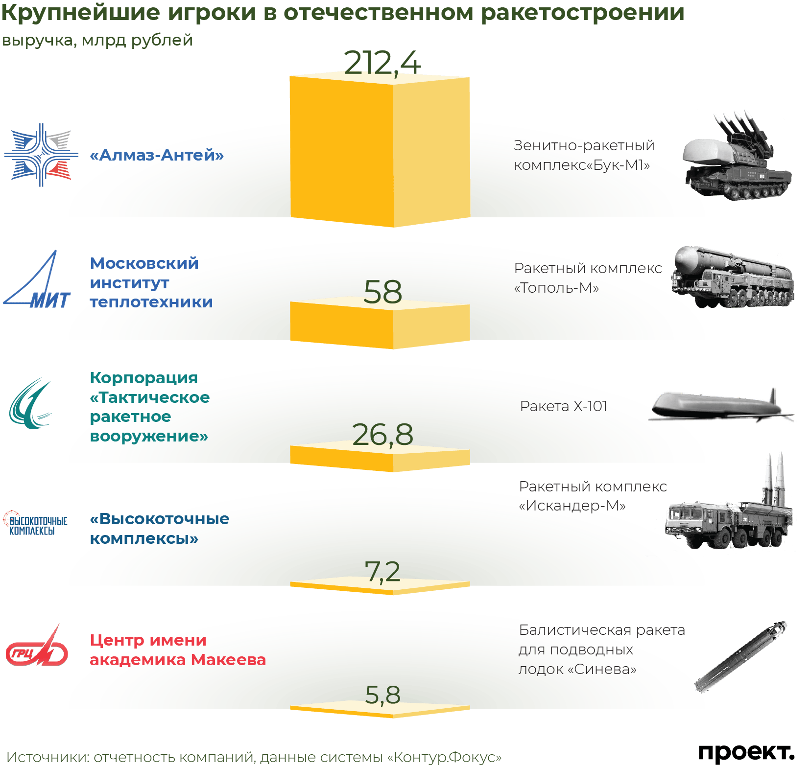 Ракетная отрасль — это ещё и передовые разработки, которыми так любит хвастаться российский президент: от ракетного комплекса «Сармат» с тяжёлой межконтинентальной ракетой до ядерной энергетической установки, которая размещается в корпусе крылатой ракеты Х-101, и гиперзвукового авиационно-ракетного комплекса «Кинжал». Чиновники и военные, представляющие Путину новый вид вооружения, резко усиливают свои позиции за счёт «близости к телу лидера», отмечает собеседник в руководстве Минобороны. Неудивительно, что за доминирование в отрасли с таким потенциалом последние годы идет ожесточённая конкуренция. Так, коломенское КБ Машиностроения (входит в состав «Высокоточных комплексов») обошло конкурентов из КТРВ, по собственной инициативе создав «Кинжал» на базе ракеты для «Искандеров», говорят два источника в военном ведомстве.