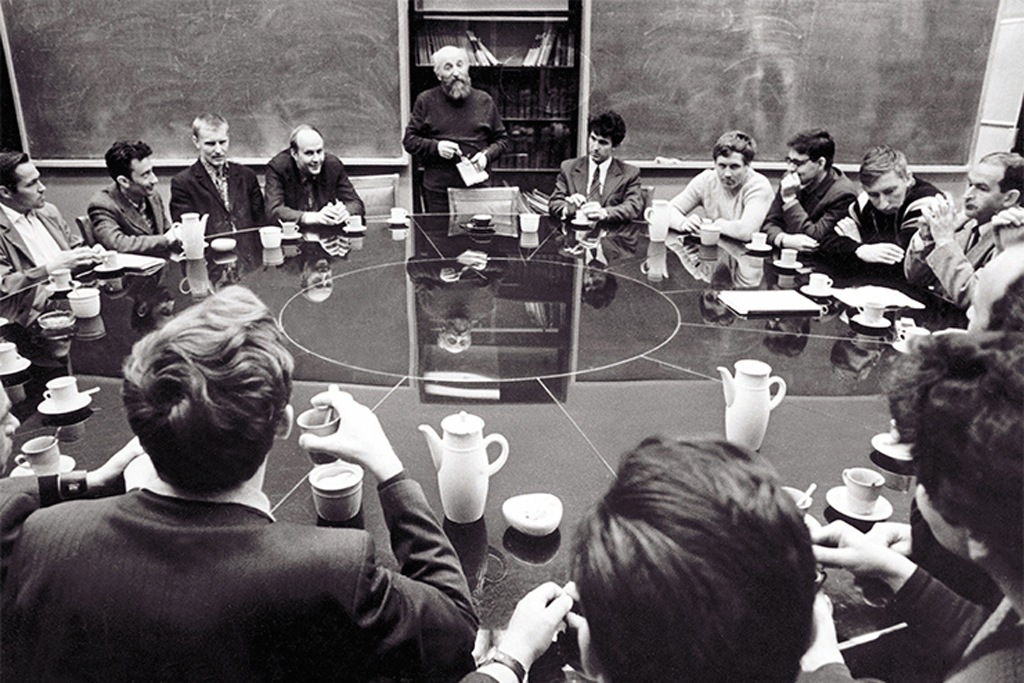 За круглым столом обсуждаются проекты новых установок и эксперименты на них, размещение заказов в производственных мастерских и распределение жилья, политические новости и театральные премьеры. Все, чем живет институт и его люди. Неважных дел нет.