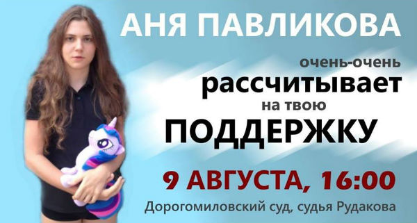 9 августа в 16:00 в Дорогомиловском райсуде Москвы ожидаются слушания о продлении ареста 18-летней фигурантке дела "Нового величия" Анне Павликовой. Она находится в больнице "Матросской Тишины". Туда же перевели другую фигурантку дела - 19-летнюю Марию Дубовик. У обеих серьезные проблемы со здоровьем.