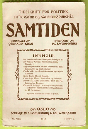 Выпуск журнала Samtiden, 1940 годЖурнал был создан в 1890 году, в том же году, когда Кнут Гамсун писал «Голод», очень важный роман для европейского модернизма. Кстати, Гамсун писал статьи для Samtiden. У наших конкурентов Gyldendal есть свой журнал, Vinduet («Окно»), но это чисто литературный журнал. А Samtiden — журнал о литературе, культуре, политике, технологиях. Но несмотря на то, что журналы принадлежат издательствам, те тратят на них небольшие средства, так что связь между журналом и издательством, я бы сказал, тонкая. Десятилетия назад Samtiden играл более заметную и важную роль. Когда я был студентом, Samtiden читали, как когда-то в России читали «Новый мир» или «Литературную газету». Сейчас ситуация изменилась, потому что появились новые медиа и, в первую очередь, социальные сети. Зачем покупать журнал, когда можно смотреть сериалы? Да и вообще в информационном поле большая конкуренция. Но несмотря на все, что я сказал сейчас, я не пессимист. Я работаю редактором Samtiden всего полтора года, и за это время тираж увеличился в три раза.