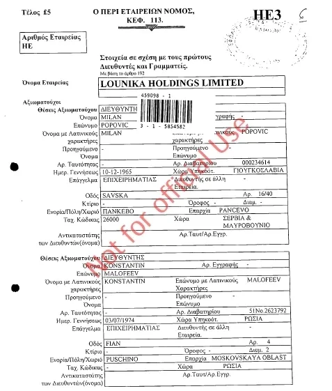 Тогда же из панамских файлов стало известно, что еще в 2005 году Попович основал компанию Lounika Holdings Limited на Кипре вместе с российским бизнесменом Константином Малофеевым. Комментируя партнерство, Милан Попович сообщил журналистам, что Lounika Holdings Limited осталась «идеей, которая никогда не была реализована», поскольку они с Малофеевым так и не смогли найти бизнес, в котором могли бы работать вместе. Кроме того, Попович добавил, что много лет знает Малофеева — «с тех пор, как он был никем». Ну да, многое со временем изменилось…