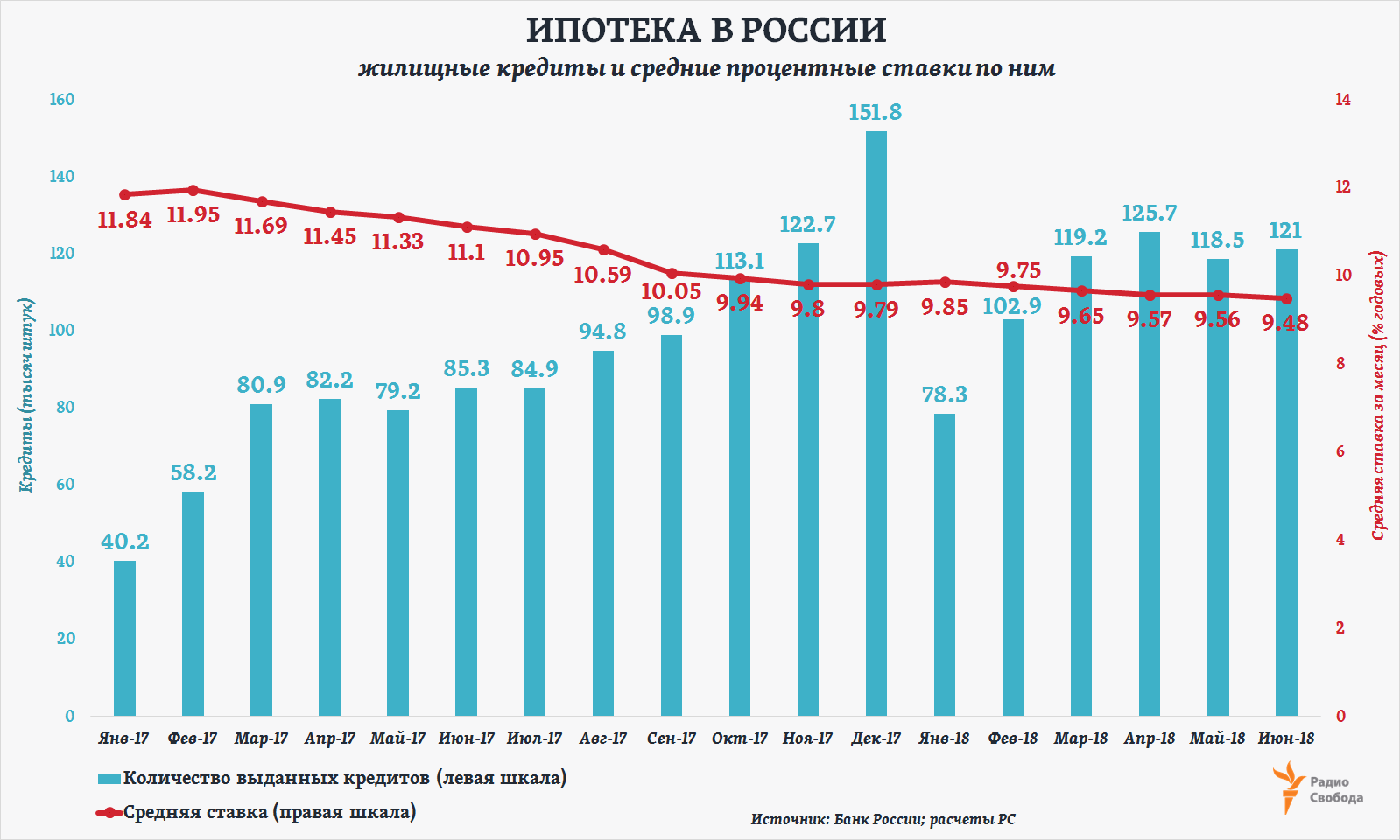 Source: официальный сайт правительства СОМНИТЕЛЬНО Снижение этих ставок, продолжавшееся два года, приостановилось еще веснойЗа последние 12 лет общее количество предоставляемых банками в течение года ипотечных жилищных кредитов выросло в России более чем в пять раз, а средняя процентная ставка по ним снизилась на треть. Последний по времени ее рост был отмечен в 2015 году (13,4% годовых), после чего эта ставка почти непрерывно снижалась, достигнув к середине 2018 года уровней менее 9,5%.
