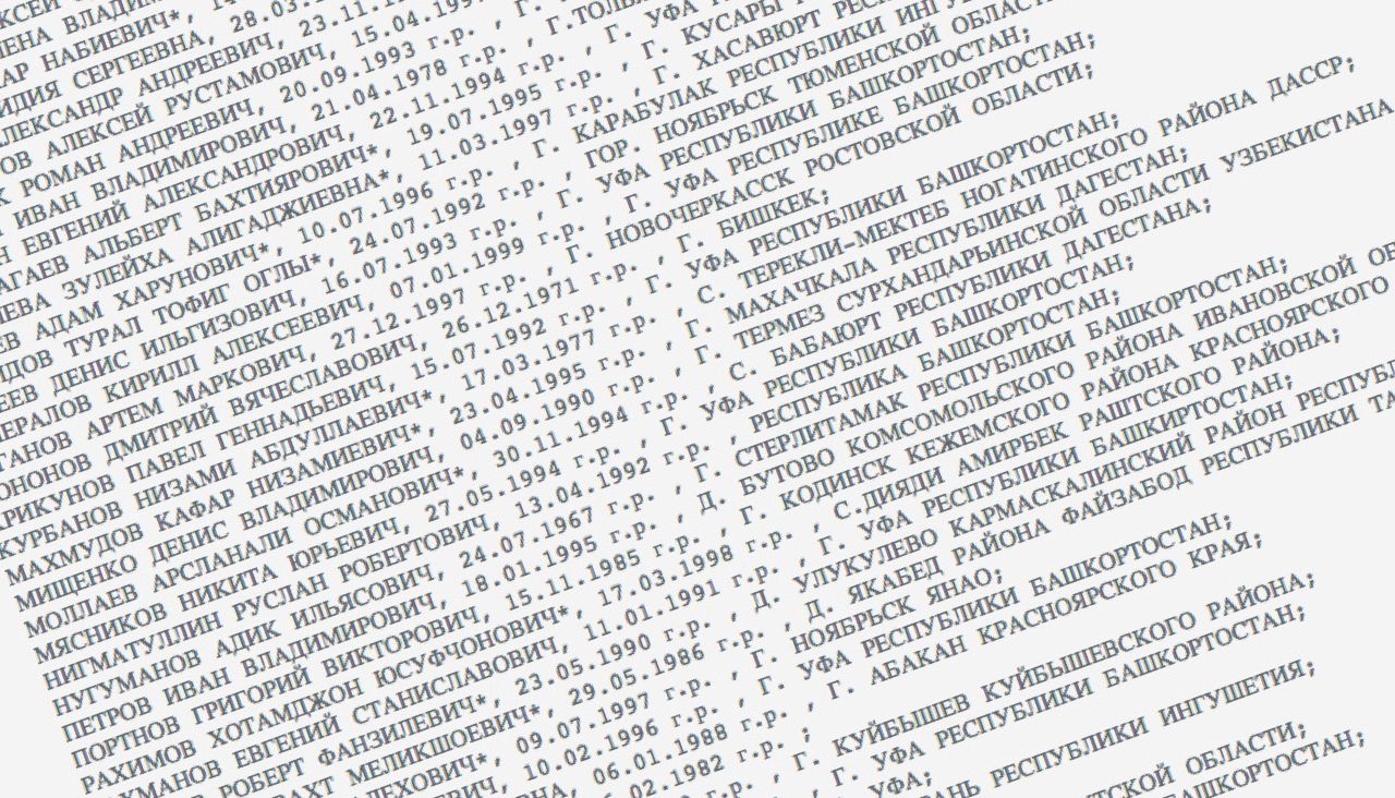 Rosfinmonitoring lists the names of 8,500 people, roughly 7,000 of whom are identified as “terrorists.” Studying changes in the data, Shukshin discovered that “Khushvakht Saidov” disappeared from the list and then reappeared, now with an asterisk beside his name. Rosfinmonitoring doesn’t say what the asterisk means, but according to Rossiyskaya Gazeta (the federal government’s official newspaper of record), the marking signifies “organizations and private entities with known connections to terrorism.” Most of the names on Rosfinmonitoring’s list have asterisks. (Meduza only found about 1,500 entries without asterisks.)