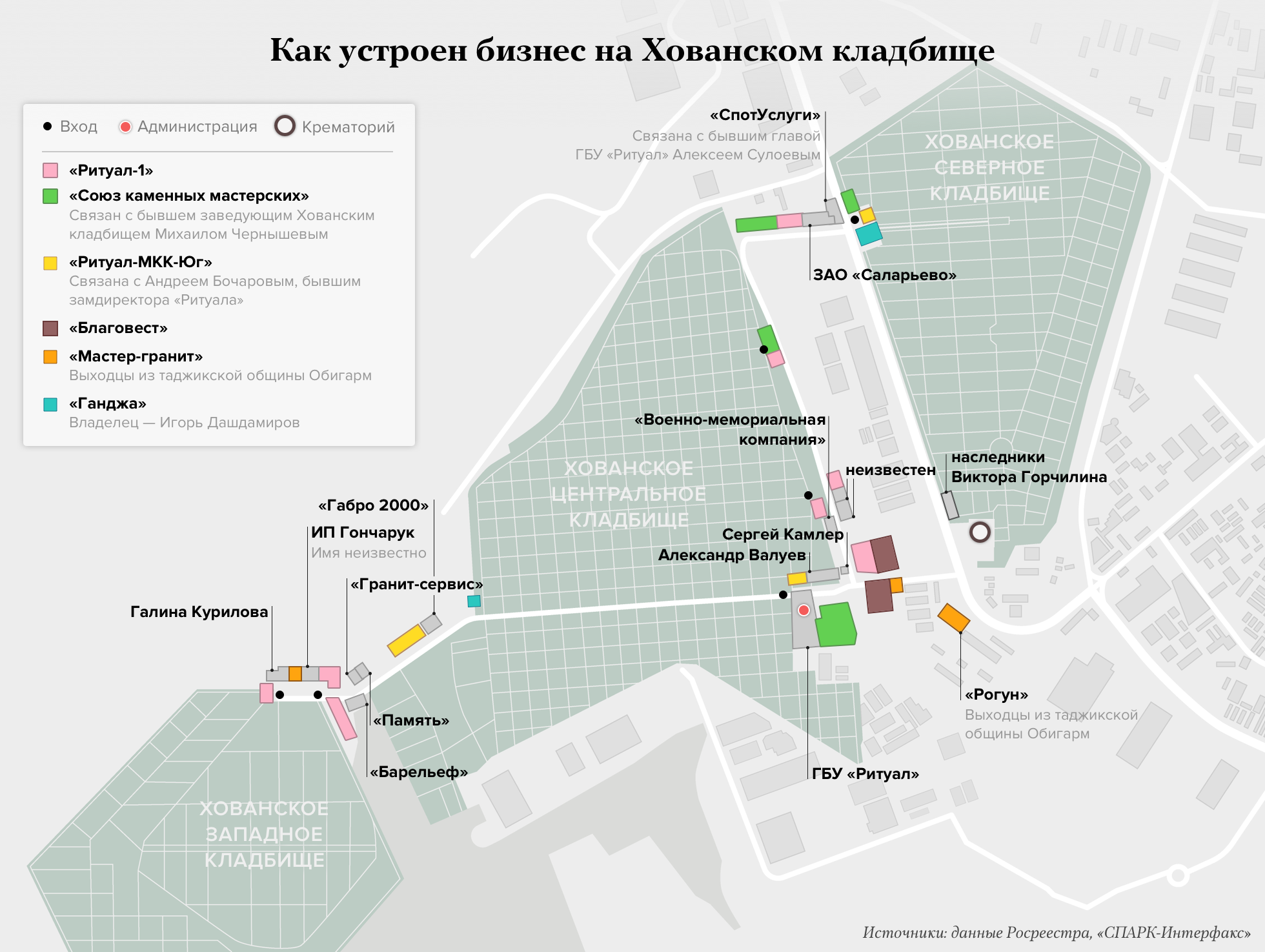 Наибольшая торговая конкуренция — на крупнейшем кладбище Москвы, Хованском, где работает более 35 точек. Две из них принадлежат Игорю Дашдамирову, которого связывали с Солнцевской ОПГ и задерживали по подозрению в убийстве телеведущего Влада Листьева. Крупнейший же здешний торговец — «Ритуал-1», одна из старейших компаний рынка, которая до сих пор является заметным продавцом ритуальных товаров и гранитных памятников. О владельцах «Ритуал-1» известно немного. Среди них — православная меценатка Вера Слепухина и уроженец Солнцево Павел Руднев, который вместе с федеральным МВД продюсирует документальные фильмы и художественные сериалы про полицейских.