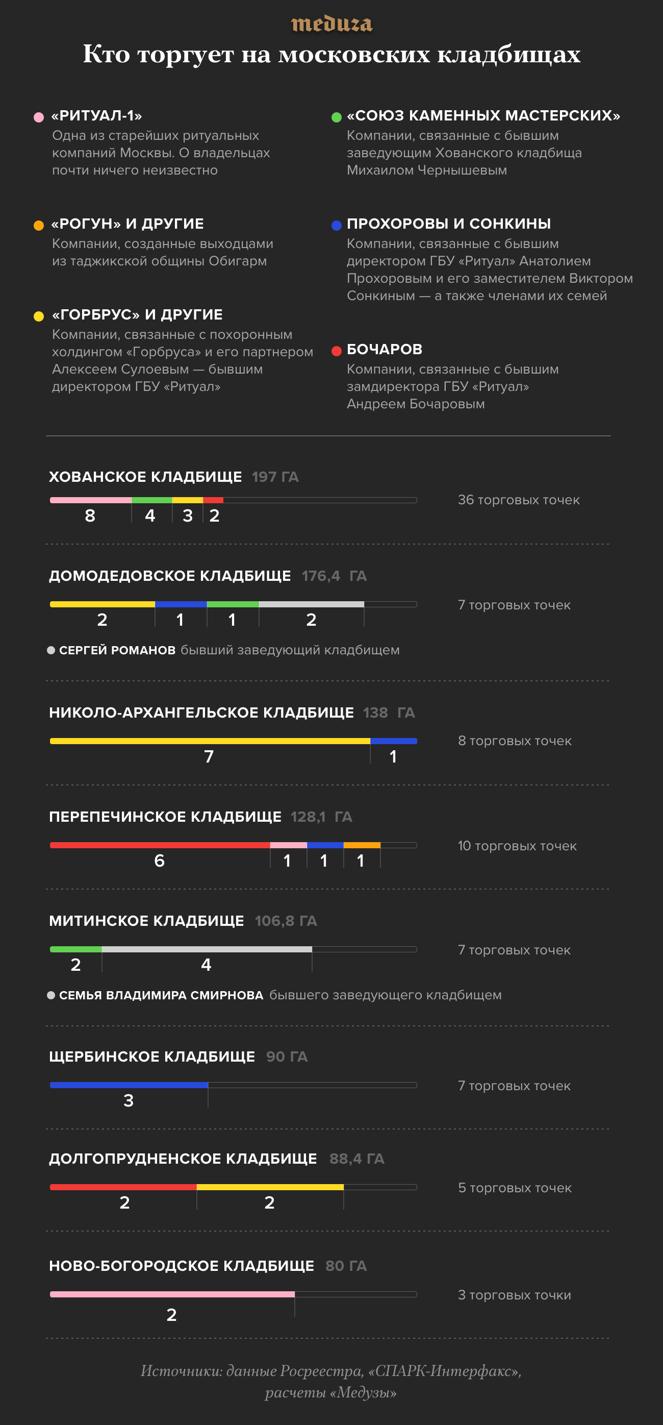 Ежегодно в России умирает около двух миллионов человек. Оборот похоронной индустрии только официально составляет около 60 миллиардов рублей в год; размер ее теневого сектора, по оценке властей, может достигать 250 миллиардов. За последние тридцать лет ритуальный рынок в России делили несколько раз — участвовали в этом и представители организованного криминала, и силовики, и государство. В результате в разных регионах постоянно возникают эксцессы: от перестрелки на Хованском кладбище в Москве до перекидывания трупов через забор в Екатеринбурге, несанкционированных массовых захоронений в Тольятти и суицида владельца кладбища в Омске. Спецкор «Медузы» Иван Голунов разобрался с тем, как устроен ритуальный рынок в России, — и выяснил, как контроль над ним постепенно переходил от людей, близких к криминальным структурам, к людям, связанным с государством.