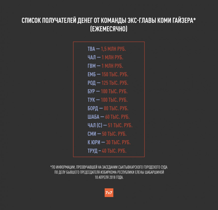 Засекреченный свидетель, который работал председателем участковой комиссии, рассказал о «людях Чернова», которые дежурили в подвале мэрии. Еще один свидетель объяснил, как на выборах 2011 года «Единая Россия» приписала себе по Сыктывкару более 30 тыс. голосов. Основные свидетельские показания касались поощрительных выплат членам «команды» Гайзера. Существование такой системы подтвердили несколько человек.