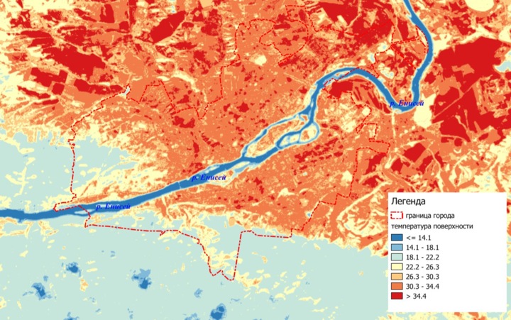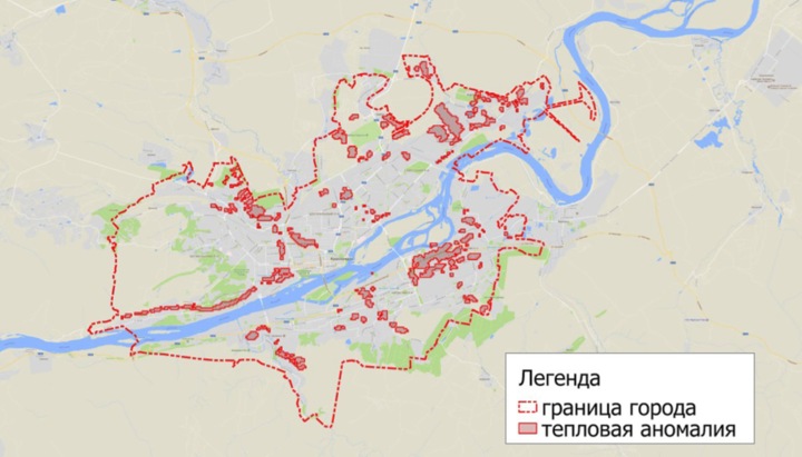 Для исследования тепловых особенностей Красноярска специалисты использовали космические снимки территории города в летние безоблачные дни. Оказалось, что аномалии, связанные с застройкой, формируются на территории возле железнодорожного вокзала и неработающего комбайнового завода. Тепловые аномалии на правом берегу Енисея наблюдаются в районе промышленной зоны: Красноярский машиностроительный завод, ТЭЦ-1, Сибирский завод тяжелого машиностроения.