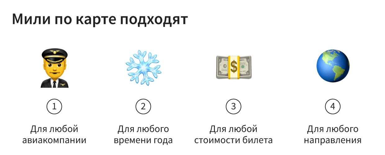 Большинство авиакомпаний предлагают постоянным путешественникам программы лояльности. Это могут быть мили или скидки. Но все они так или иначе ограничивают выбор перевозчика, аэропорта или направления. К тому же не всегда удобны: нужно высчитывать количество бонусов для покупки определенного билета, курс конвертации миль в деньги не всегда понятен, а сами бонусы начисляют только за покупку билетов определенной авиакомпании. Банковская карта All Airlines Black Edition позволяет компенсировать милями билеты абсолютно любой авиакомпании. При этом 1 миля стоит 1 рубль. И естественно, что можно одновременно копить и мили авиакомпаний, и мили по карте.