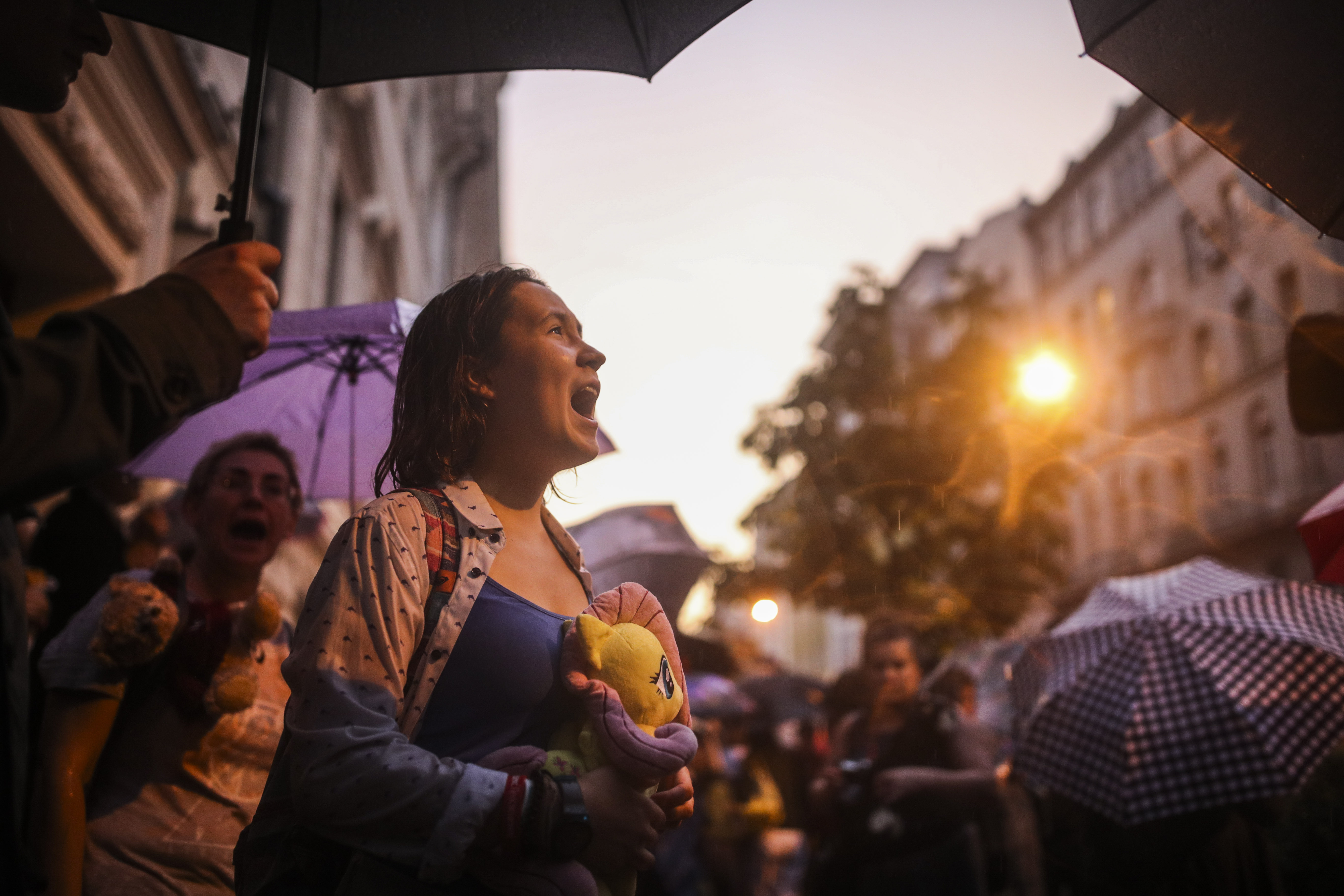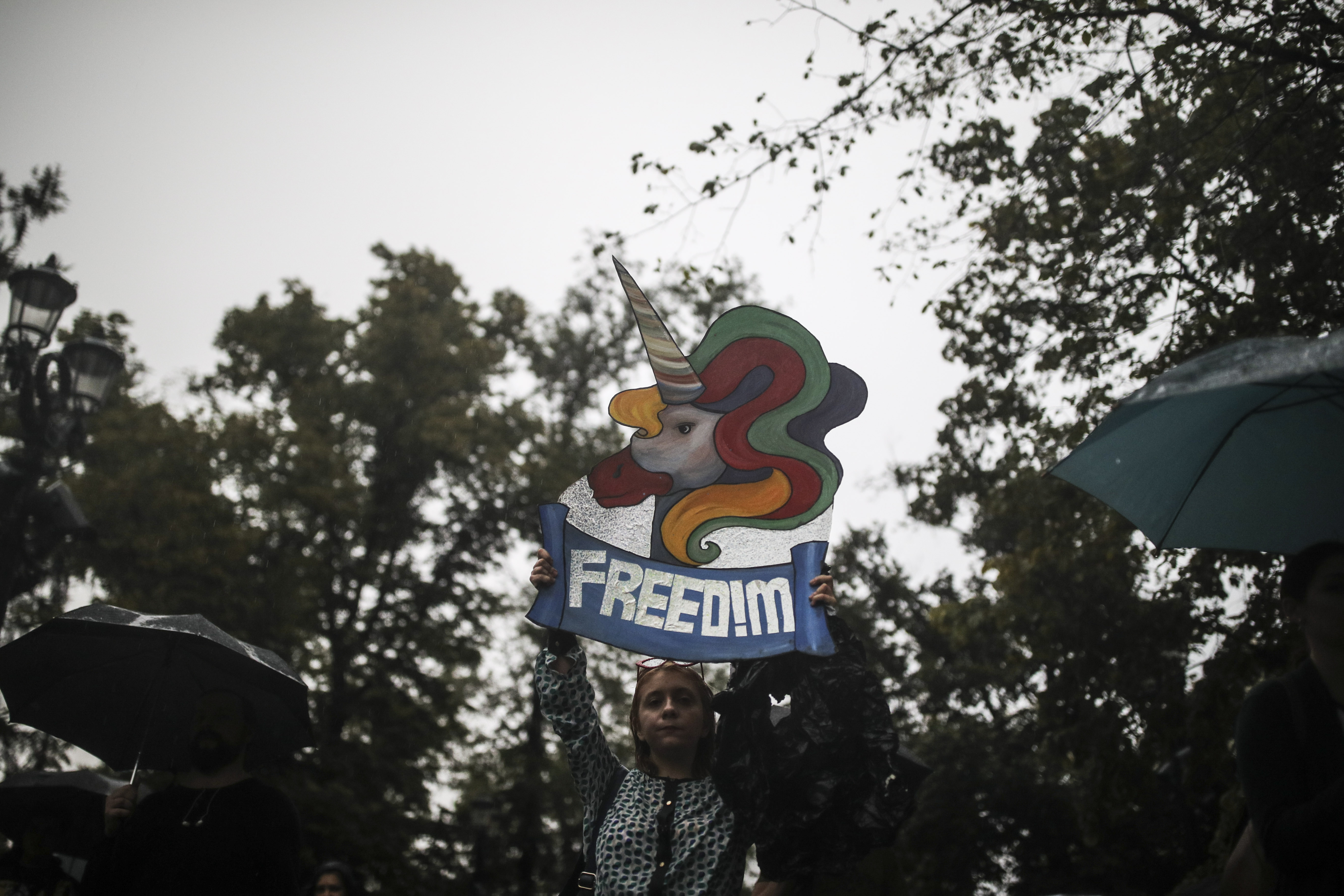 Дойдя до здания Верховного суда под проливным дождем, митингующие начали скандировать: «Свободу!» и «Дети не должны сидеть в тюрьме!».