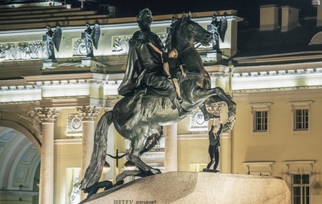 В ночь на 5 августа многочисленных туристов на Сенатской площади поразила дерзкая выходка компании молодых людей. Один из них оседлал коня работы скульптора Фальконе, девушка повисла на башмаке первого российского императора, парень уселся ему на шею, а их товарищ забрался Петру I на колени. Всего по каменно-бронзовой композиции топтались и прыгали пять человек.