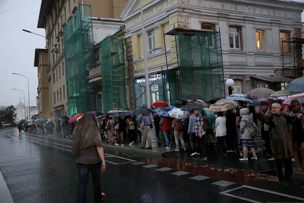 Похоже, стоять все готовы долго. Некоторые уже убрали зонты, потому что держать их над головой бессмысленно. Все вымокли насквозь.