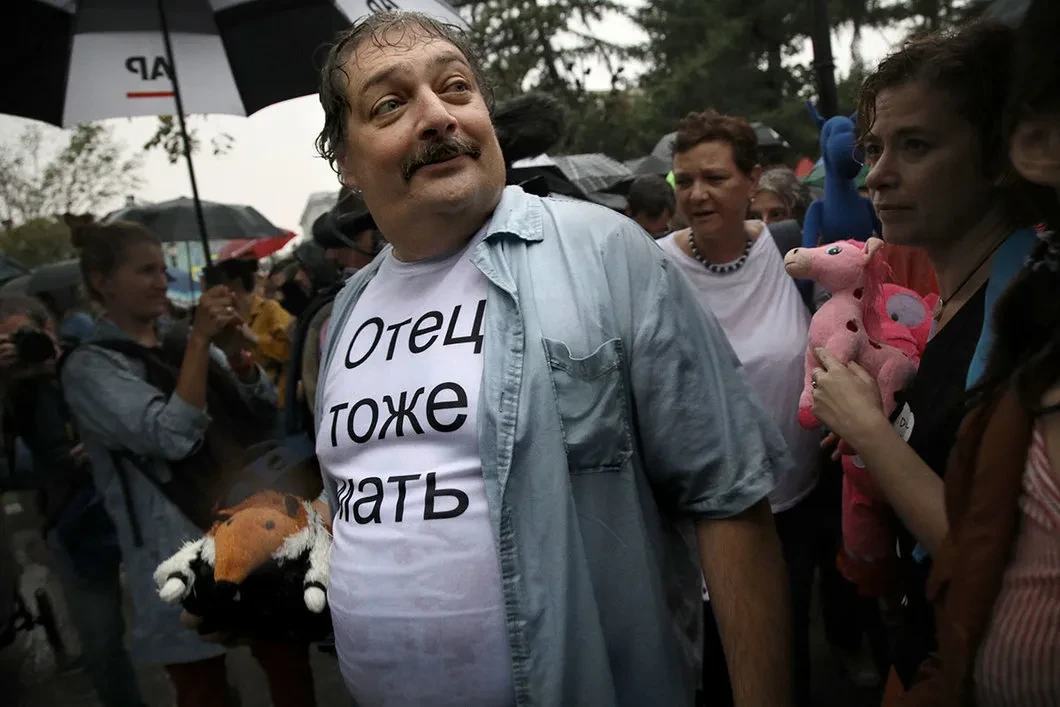 Писатель Дмитрий Быков в белой, прилипшей к телу мокрой майке с надписью «Отец тоже мать» от комментариев отказывается. Собственно, комментировать действительно нечего.