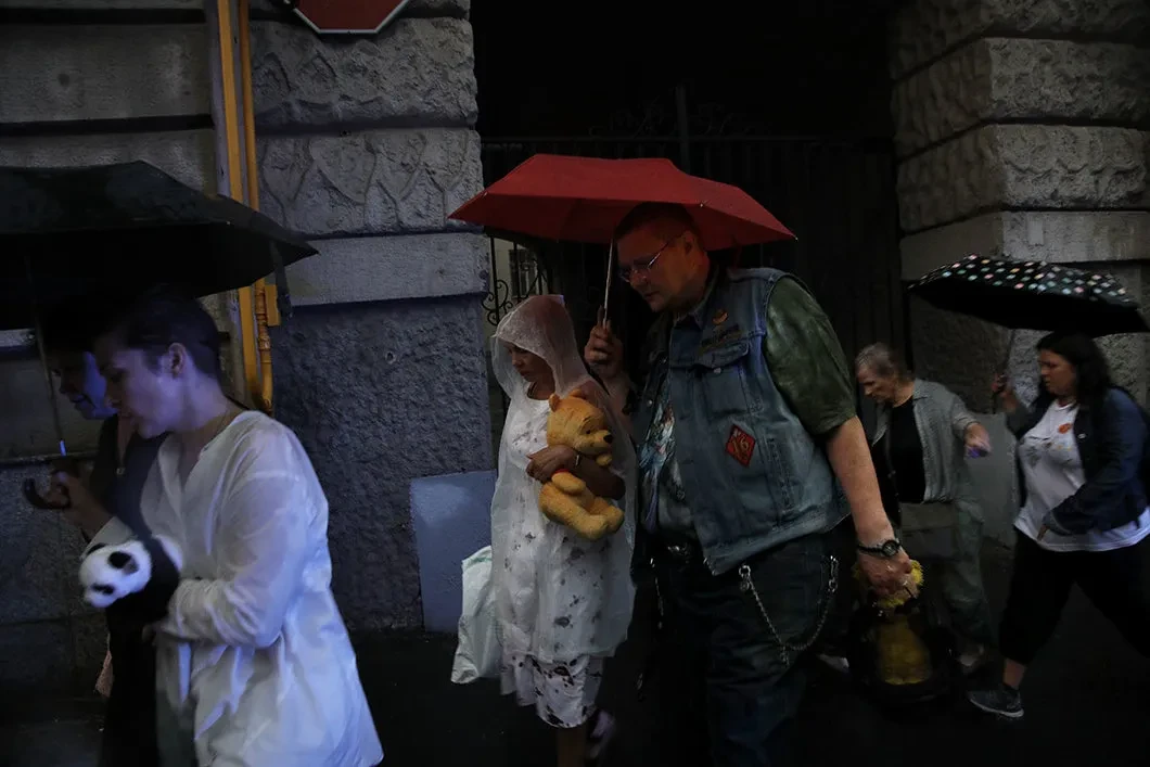 Людей становится все больше и больше. Идут спокойно, без лозунгов и кричалок. Дождь льет нещадно, и игрушки в руках тоже промокают. На голову огромного плюшевого медведя его хозяин натягивает полиэтиленовый пакет.