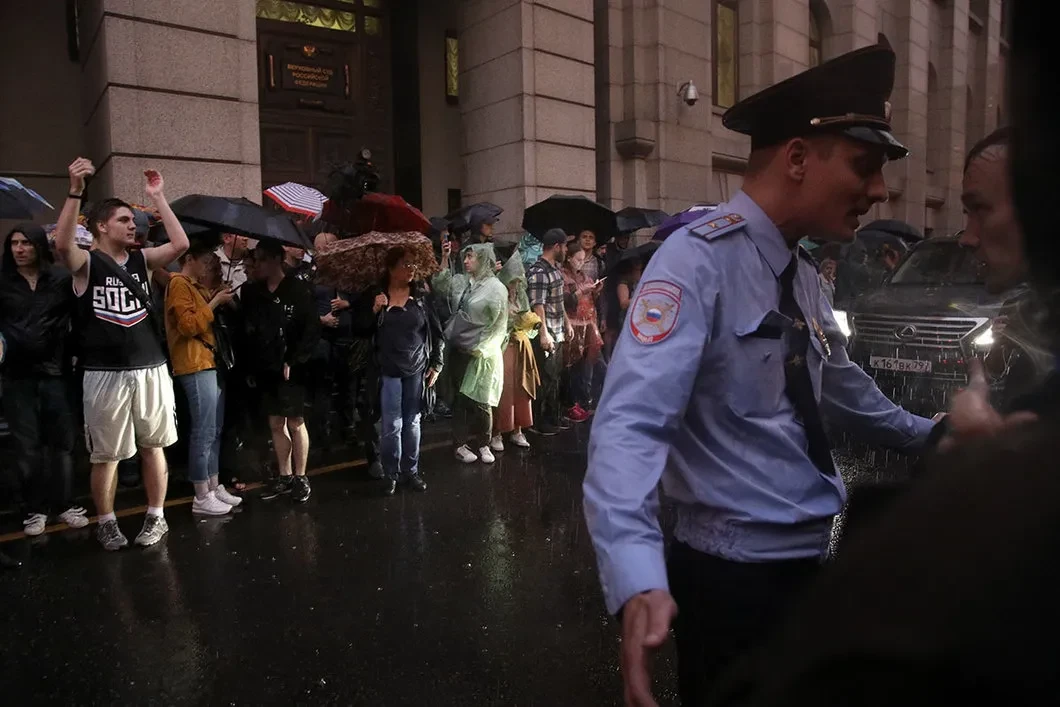 У здания Верховного суда собирается промокший марш. Полиции не видно, хотя в начале улицы стоят автозак и несколько спецмашин.