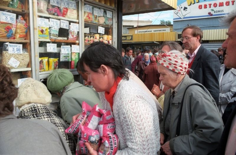 В августе цены на потребительские товары выросли на 3,7%, а в сентябре — сразу на 38,4%. В магазинах впервые с распада СССР начали исчезать продукты и выстроились очереди. Зарплаты перестали платить даже в некоторых коммерческих фирмах. У российских туристов в Крыму не хватало денег на обратный билет.