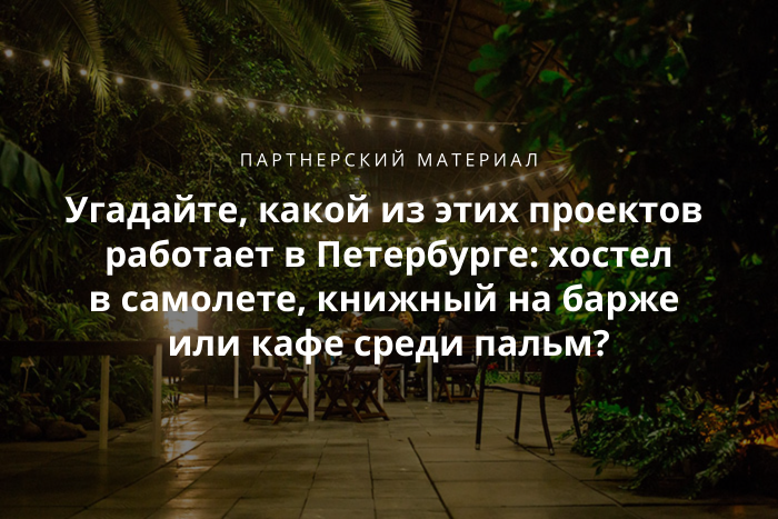 Угадайте, какой из этих проектов работает в Петербурге: хостел в самолете, книжный на барже или кафе среди пальм?