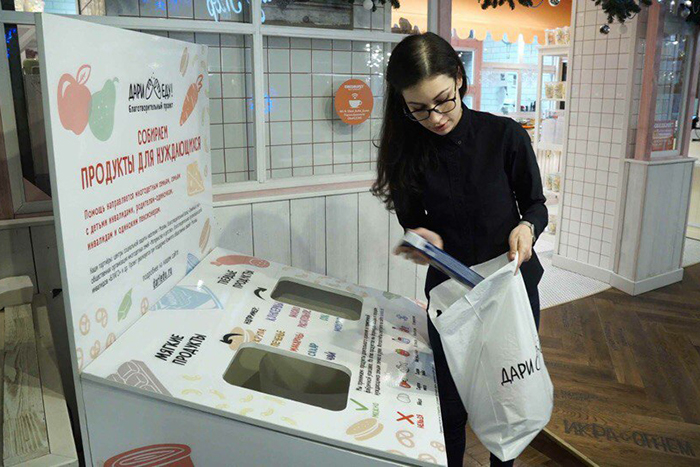 Благотворительный проект «Дари еду!» запустился в Петербурге в июле 2015 года. В трех продуктовых магазинах города установили специальные боксы, куда можно положить еду для нуждающихся. Продукты затем передают в органы социальной защиты и партнерские благотворительные фонды. Перед передачей волонтеры проверяют сохранность упаковки и сроки годности. На момент публикации материала в «Дари еду!» собрали уже 9 тонн продуктов. Теперь организаторы проекта хотят запустить сайт, через который можно было бы жертвовать продукты.