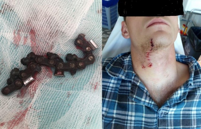 Молодой человек распиливал бревно электропилой, от которой оторвался 10-сантиметровый кусок железа и впился в шею. При этом на парне была надета пластиковая маска.