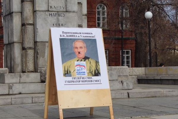 На акции был выставлен большой плакат с карикатурой на главу региона - портретом, на котором Морозову поверх его усов были пририсованы усы другого фасона, которые носил Адольф Гитлер. Карикатура сопровождалась подписью "Переименовали площадь В. И. Ленина в Ульяновске! Гитлер не смог, губернатор Морозов смог?". Имелись в виду действия германской администрации во Вторую мировую войну на оккупированных советских территориях: все большевистские названия заменялись другими.