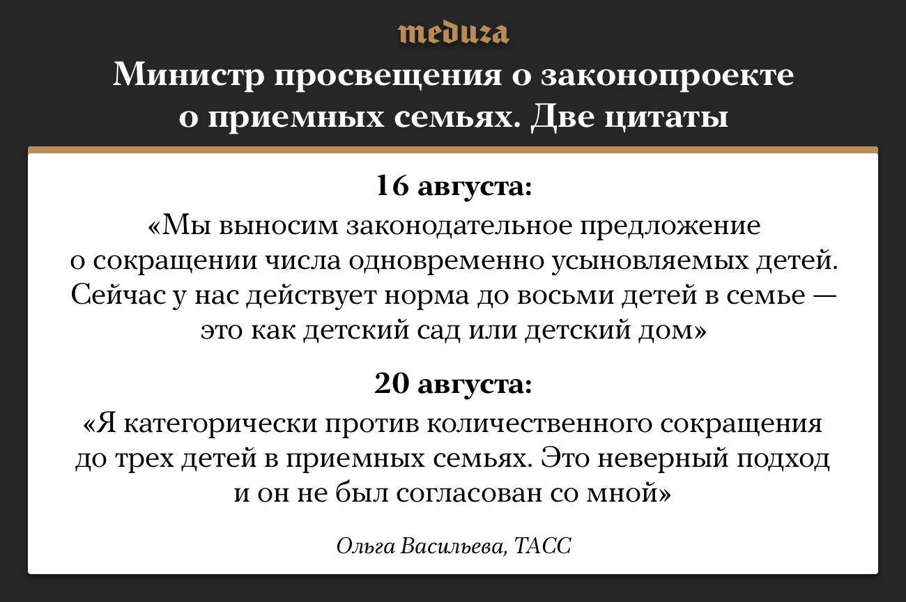 Министр просвещения Ольга Васильева предложила ужесточить правила усыновления для «так называемых родителей» в России. 17 августа в СМИ появился соответствующий законопроект министерства, предлагающий с 2020 года сократить до трех число детей в приемных семьях. 20 августа Васильева выступила категорически против этого документа, заявив, что его разрабатывало не ее ведомство, а министерство образования.