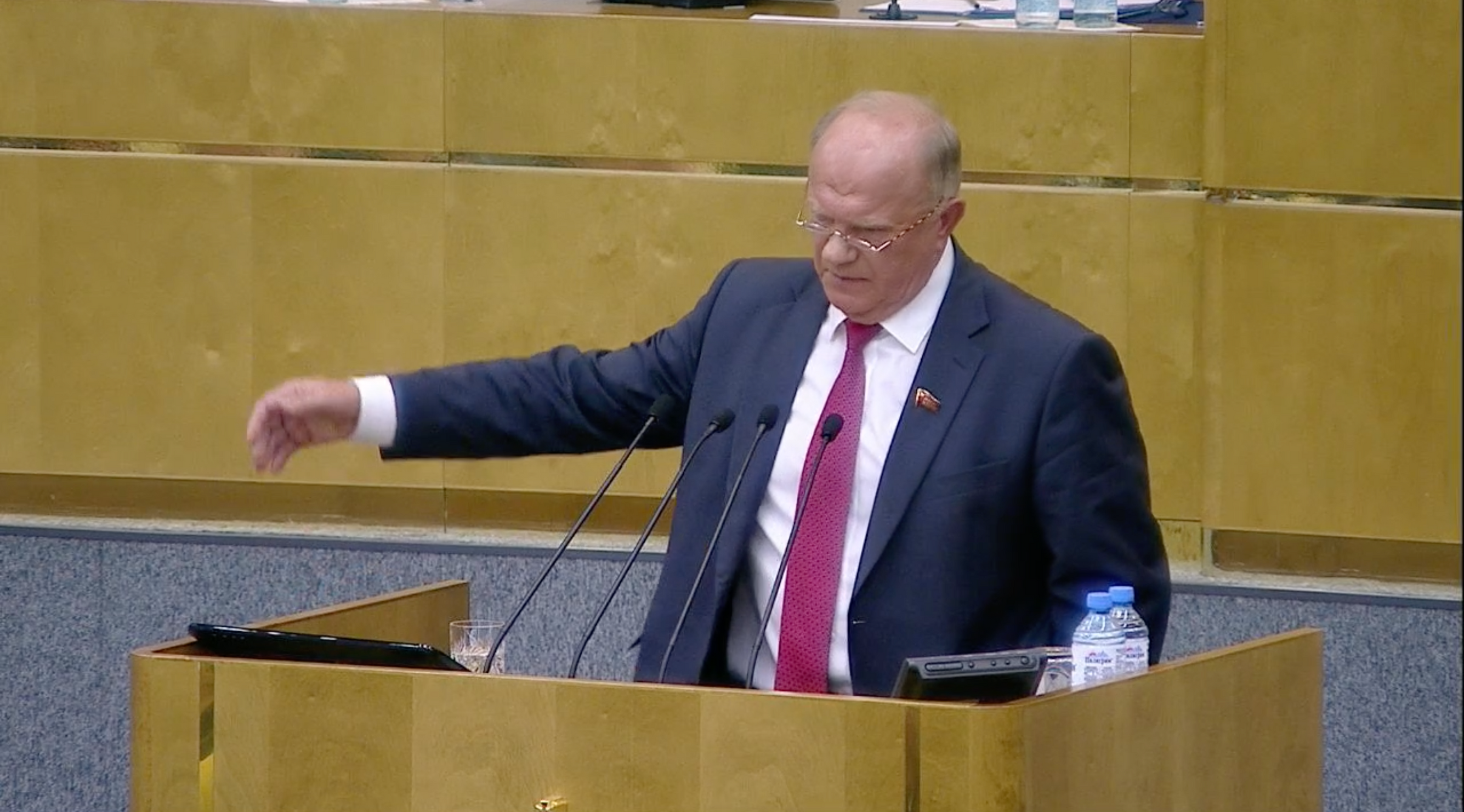 Глава КПРФ начинает с того, что цитирует обращение Путина к Федеральному собранию (про победу над бедностью, не про ракету с непредсказуемой траекторией полета).