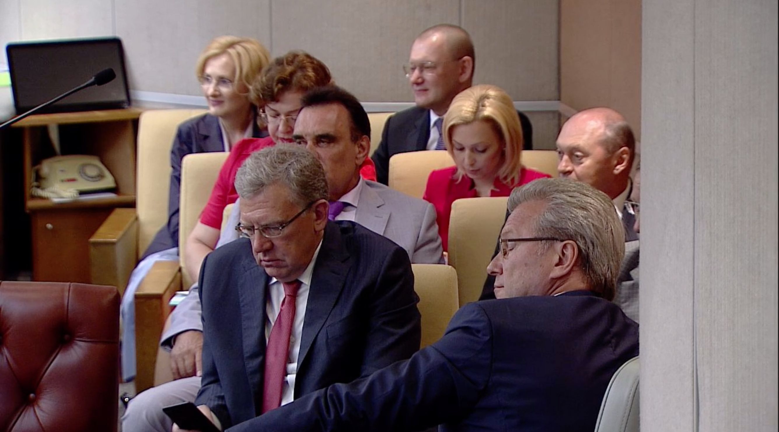 Снова на трибуну вернулся глава Счетной палаты Алексей Кудрин. Он должен ответить на вопросы, прозвучавшие во время предыдущих выступлений, например, о софинансировании пенсий и взносах.