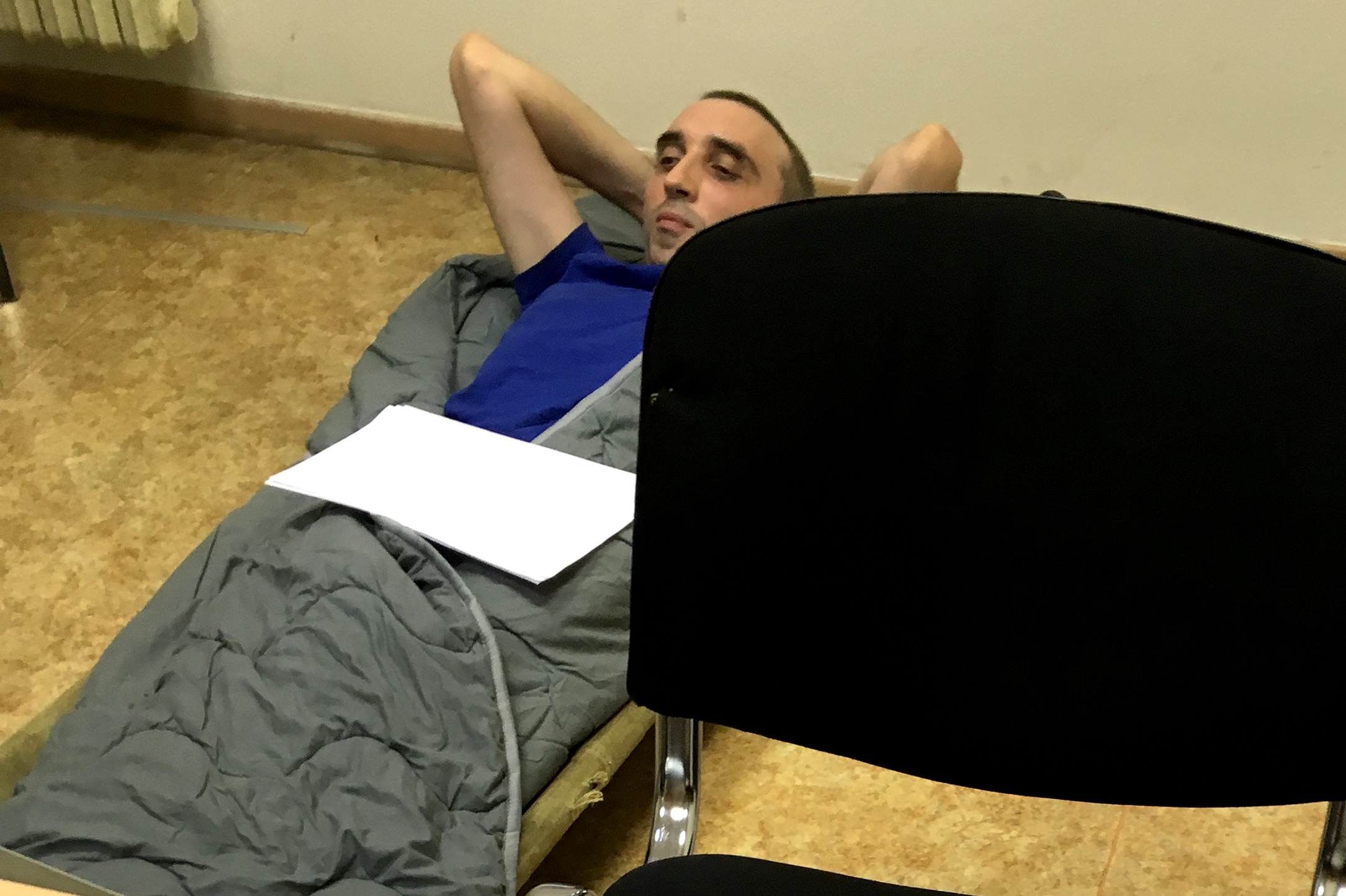 Адвокат Цзен рассказал, что заседание проходило в конвойном помещении №143 по соседству с комнатой №144, где арестантов пристегивают наручниками к вмонтированным в стену металлическим кольцам. Милосердов лежал на носилках из-за болей в спине.