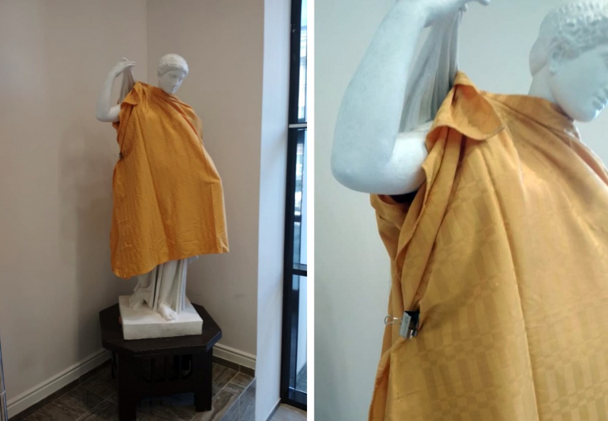 В Новосибирском государственном университете архитектуры и дизайна к визиту делегации священнослужителей РПЦ в фойе первого этажа прикрыли тканью статуи обнажённых мужчин и женщин. Как сообщает НГС.Новости, сегодня в вузе проходил форум "Новосибирск - город безграничных возможностей", куда приехали представители местной епархии обсуждать доступность храмов для маломобильных граждан.