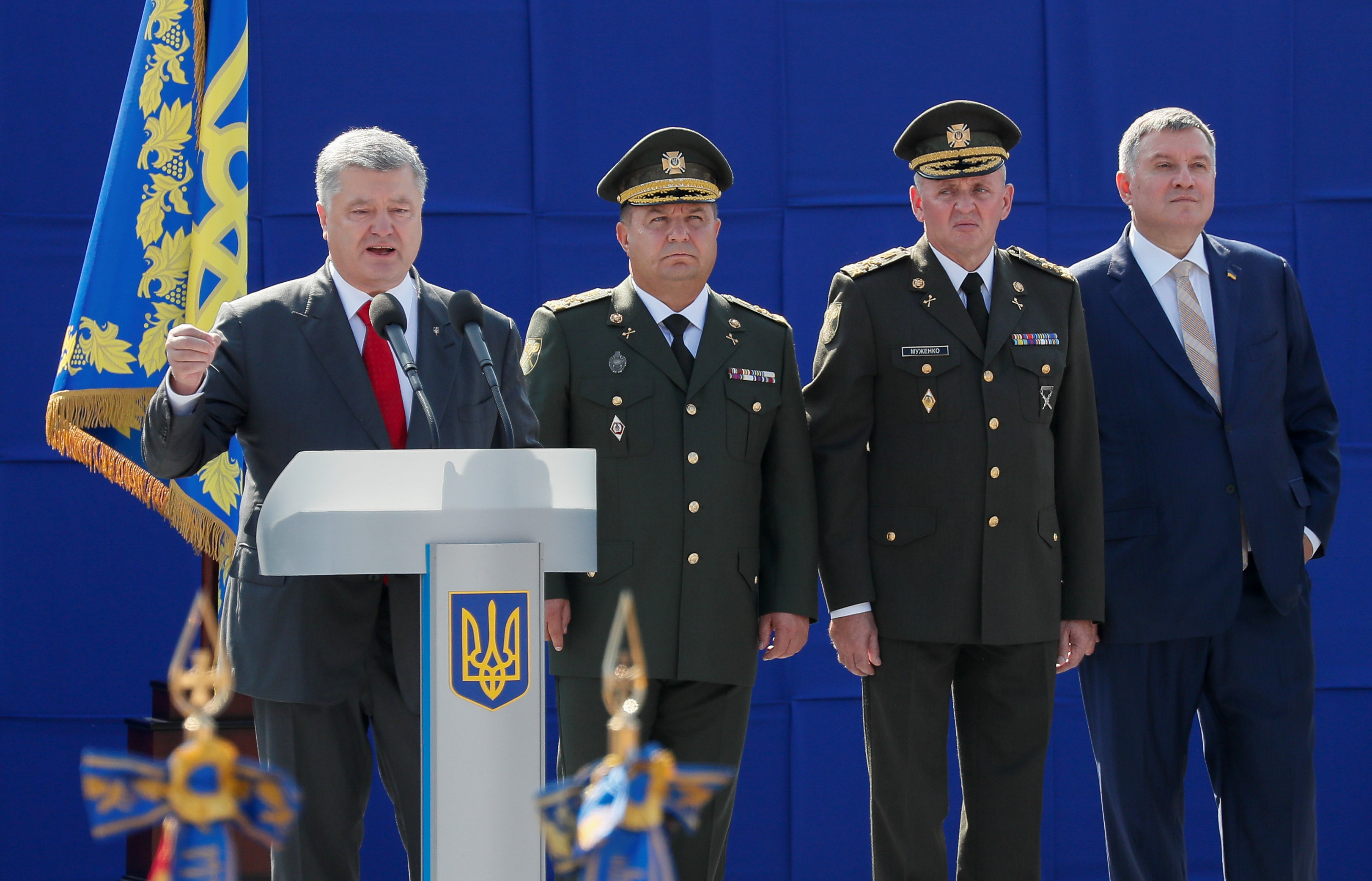 Во время марша Петр Порошенко зачитал указы о предоставлении украинским воинским формированиям новых названий. В частности, 30-й отдельной механизированной Новоград-Волынской Ровенской бригаде присвоено почетное наименование "Имени князя Константина Острожского", 55-й артиллерийской бригаде имени генерал-полковника Василия Петрова – "Запорожская Сечь", а 93-я отдельная механизированная Харьковская бригада отныне будет называться "Холодный Яр".