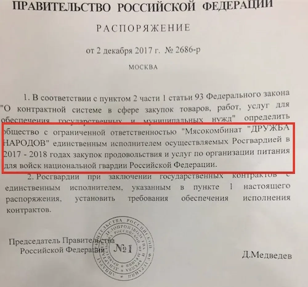 23 августа Алексей Навальный опубликовал расследование, из которого следует, что 2 декабря 2017 года премьер РФ Дмитрий Медведев наделил крымскую фирму «Мясокомбинат «Дружба народов» эксклюзивным правом поставлять продукты для Росгвардии без каких-либо конкурсов и конкуренции. И теперь Росгвардия — все 340 тысяч ртов — кормятся продуктами только от этой фирмы.