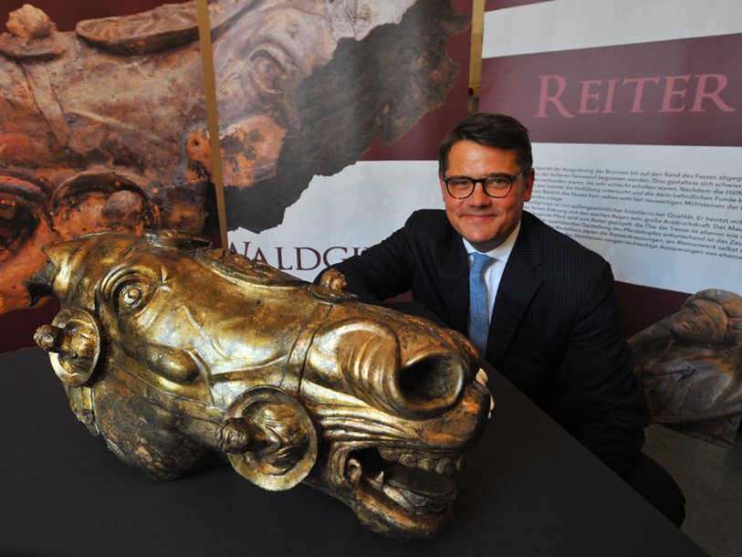 Министр науки и искусства Гессена Борис Райн с конской головой Hessian Ministry of Science and Art После долгой реставрации недавно была представлена публике позолоченная бронзовая конская голова, найденная археологами в 2009 году у деревни Вальдгрим в центральной Германии. Теперь ее могут увидеть посетители Музея римского форта Заальбург, расположенного рядом с городом Бад-Хомбург в федеральной земле Гессен.
