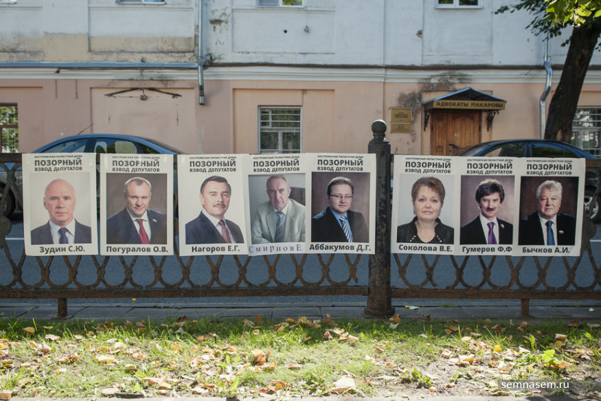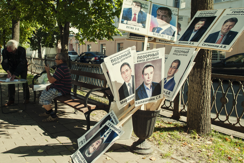Портреты депутатов Костромской областной думы — единороссов, поддержавших законопроект о пенсионной реформе, — расставили на лавочке и повесили на решетке ограды возле столика, за которым шел сбор подписей за признание «Единой России» экстремистской организацией. Здесь же были размещены портреты президента Владимира Путина и премьер-министра Дмитрия Медведева.