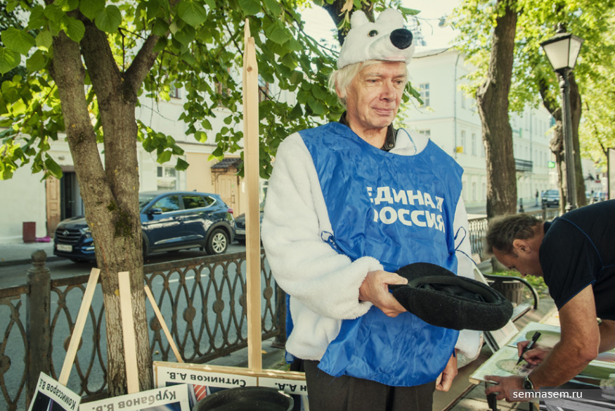Правозащитник, член Альтернативной общественной палаты Костромы Виктор Епифанов в костюме белого медведя и накидке с надписью «Единая Россия» собирал 30 сребреников для депутатов-единороссов.