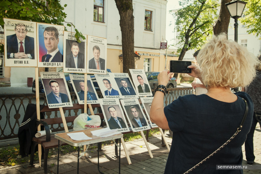 Пикетчики с портретами оставшихся депутатов-единороссов с надписью «Позорный взвод» рассредоточились по аллее проспекта Мира на большом удалении друг от друга.