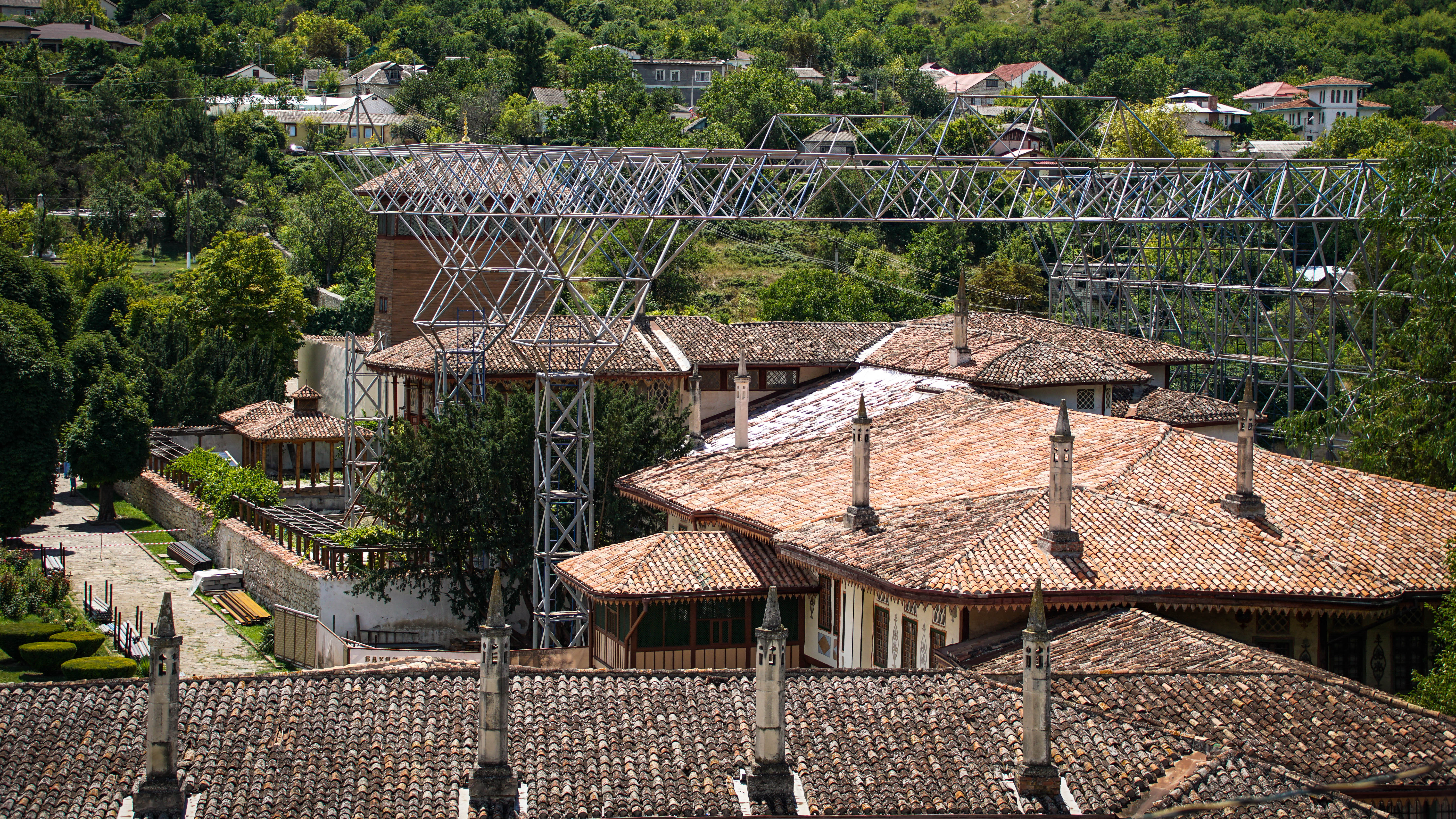 «Уже смонтированная конструкция, там будет купол, который позволит разобрать крышу, для того чтобы снять нагрузку и проводить в дальнейшем уже именно реставрационные работы», – рассказывает для СМИ руководитель подконтрольной Кремлю администрации Бахчисарая Александр Трянов.