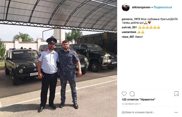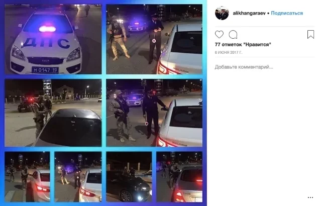 После этого допроса Алихан Гараев удалит из своего аккаунта в инстаграме коллаж из шести фотографий, на которых он в форме сотрудника ДПС на служебной машине с номерами м 0147 95 региона проводит совместный рейд с сотрудниками в армейской камуфляжной форме зеленого цвета с нашивками ГБР. Фотография была размещена 6 июня 2017 года.