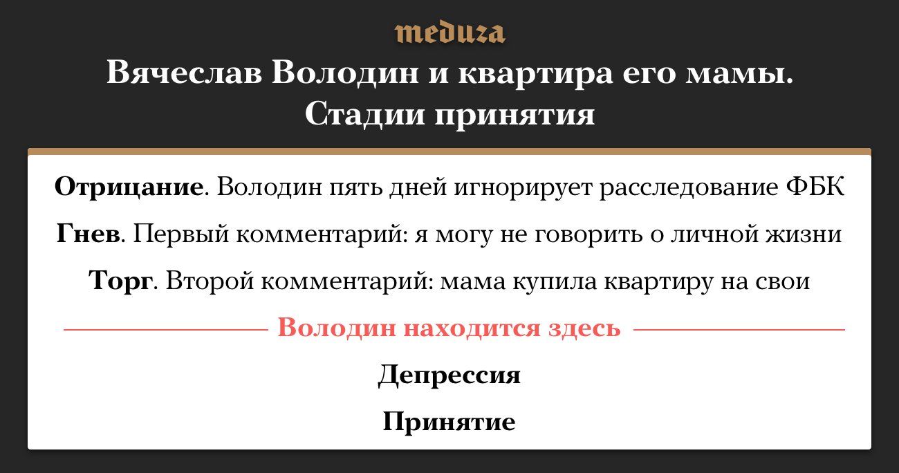 И о матерях. Спикер Думы Вячеслав Володин спустя почти две недели после расследования ФБК о квартире его матери за 230 миллионов рублей все-таки не выдержал и начал давать объяснения. Пока он утверждает, что женщина купила ее «на свои деньги». Интересно, что будет дальше.