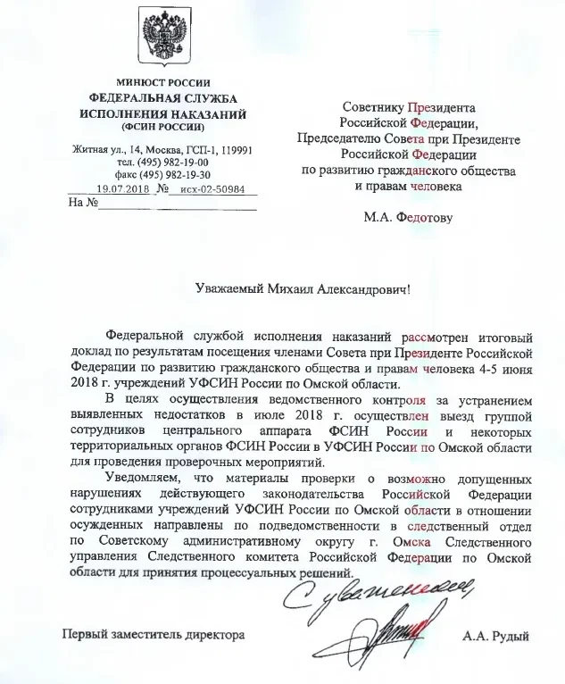 «Материалы проверки о возможно допущенных нарушениях действующего законодательства РФ сотрудниками учреждений УФСИН РФ по Омской области в отношении осужденных направлены по подведомственности в следственный отдел по Советскому административному округу г. Омска СУ СК РФ по Омской области для принятия процессуальных решений», — сказано в письме первого заместителя директора ФСИН Анатолия Рудого на имя председателя СПЧ.