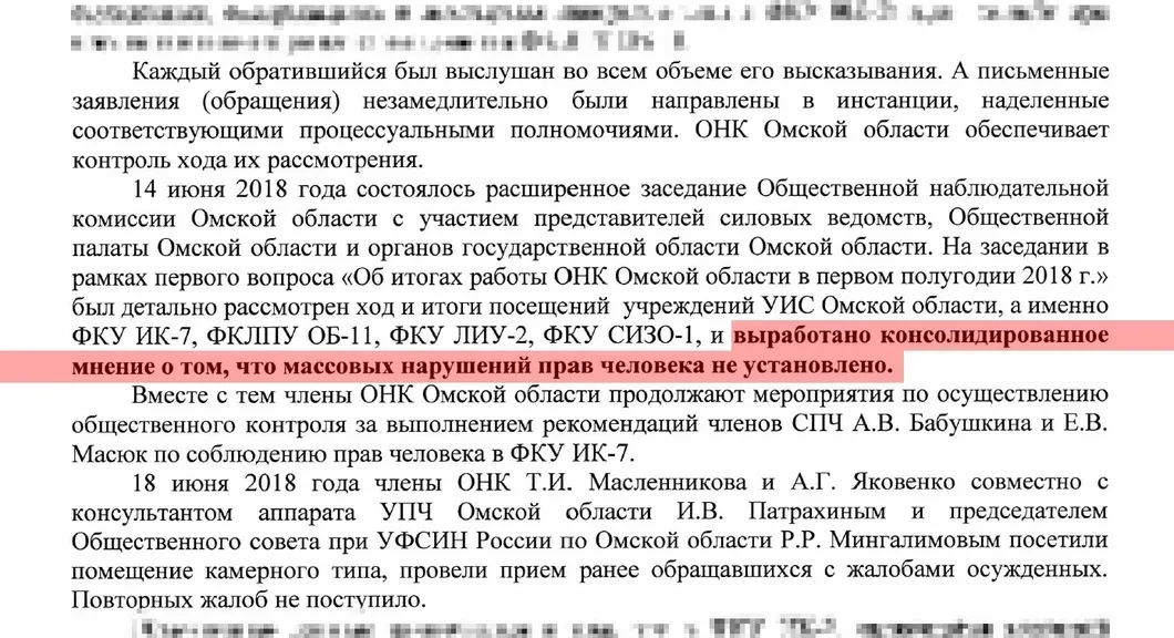В то же время ОНК Омской области в своем официальном письме на имя председателя СПЧ Михаила Федотова сообщила, что ОНК Омской области, Общественная палата Омской области, местные силовые ведомства и органы государственной власти «выработали консолидированное мнение о том, что массовых нарушений прав человека не установлено» (.PDF 1,2 MB).