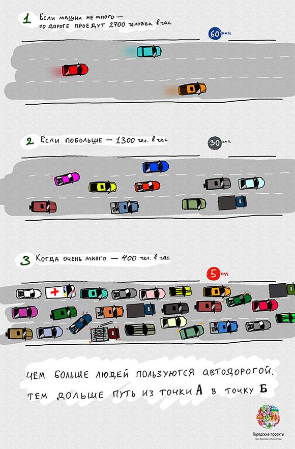 Автомобильные дороги очень уязвимы к перегрузке, и чем больше по ним ездит людей, тем менее качественный сервис они предоставляют. Ехать по ним становится дольше, комфорта меньше, пропускная способность падает и т. д.