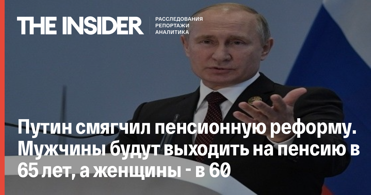 Президент России Владимир Путин предложил смягчить пенсионную реформу, чтобы мужчины выходили на пенсию в 65 лет, а женщины – в 60. Об этом он заявил во время специального телеобращения.