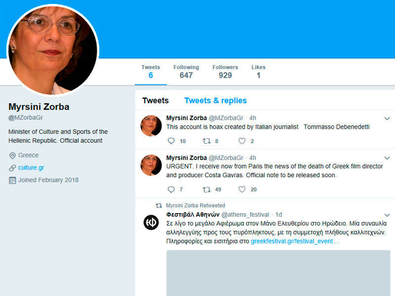 Греческий и французский режиссер Константин Коста-Гаврас был вынужден опровергать информацию о своей кончине после того, как ряд изданий в четверг выпустили на него некрологи. В качестве источника они использовали сообщение из микроблога Twitter, созданного от имени министра культуры Греции Мирзини Зобры. На самом деле этот аккаунт завел итальянский пранкер и журналист Томассо де Бенедетти, сообщает RTBF.